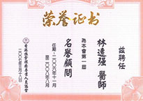 全港中医师联合会(会员)、香港中医药管理委员会、香港表列中医师、港九中医师公会(会员)、东方古代科学研究所、伤科推拿整脊证书、全国健康产业工作委员会(高级整脊师)、中国职工教和职业培训协会(整脊师)、台湾脊椎矫正学会(台湾脊椎矫正证书)、国际手法治疗协会(挑针,火针疗法证书)、吕教授国际刮痧健康研究所(刮痧结业证书)、City&Guilds学技巧培训证书、中华运气医学学会(第一届理会会长)、人力资源和社会保障部职业技能鉴定中心(按摩师考评员)